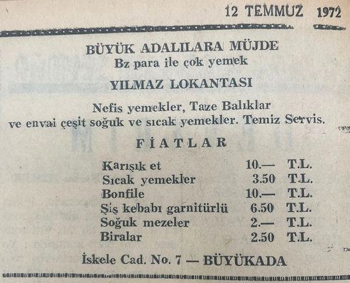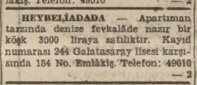 Apartıman tarzında denize fevkalâde nazır bir köşk 3000 liraya satılıktır. Kayıd numarası 244 Galatasaray lisesi karşısında 184 No. Emlâkiş. Telefon: 49010.