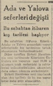 Adalar – Anadolu – Yalova hattında 1 Birincikânun 940 tarihinden itibaren kış tarifesi tatbik olunacaktır. (11380)İkdam, 1 Birinci Kânun (Aralık) 1940, Pazar