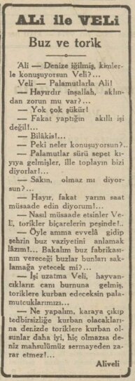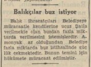 “- Belediye riyaseti bize tahriren tezkere gönderirse size buz veririz. Şifahi emirle hareket edemeyiz. Sonra mesul oluruz.” Belediyenin tahriri emri buz fabrikasına bu sabaha kadar gönderildiği takdirde fabrika balıkçılara bin kalıp buz verebileceğini bildirmiştir. Bin kalıp buzla on bin çift torik buzlanabilecektir. Balıkçılar cemiyeti dün balık mıntakalarına verdiği malûmatta denize çıkılmasını ve on bin çift torik tutulmasını bildirmiştir. Bugün Balıkhaneye on bin çift torikten ne miktar fazla balık gelirse derhal denize dökülecektir. Buz tedariki nisbetinde balık tutulacağından belediye buz fabrikası yarın için ne miktar buz verecekse bu akşam o kadar balık tutulacaktır.