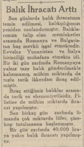 Son günlerde balık ihracatının temin edilmesi, balıkçılığımızı yeniden canlandırmıştır. Balıklarımıza talip olan memleketler arasında Romanya ve Bugaristan baş mevkii işgal etmektedir. Evvelce Yunanistan ve İtalya birinciliği muhafaza etmekte idi. Bir iki gün zarfında Romanyaya yalnız taze balık gönderilmekle kalınmamış, mühim miktarda da tuzlu torik lâkerdası ihraç edilmiştir.