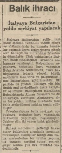 İtalyaya Bulgaristan yolile taze balık satılma imkânını tedkik etmek ve alâkadarlarla bu hususta temaslar yapmak üzere Bulgaristana gitmiş olan balıkçıların murahhası İstanbula dönmüştür. Türk balıkçılarile İtalyan balık ithalatçıları arasında anlaşmaya varılmıştır. İtalyanların soğuk hava tesisatını havi vagonları Bulgaristanda bekletilecek, Türk balıkçılarının tedarik edeceği büyük motörlerle taze torik ve palamutlarımız Bulgaristana götürülecektir. İlk partide bu yoldan İtalyaya yüz bin liralık mal sevkedilmek üzere akreditif açılmıştır. Balıkçıların murahhası Bulgaristanda Alman firmaları ile de anlaşmaya varmıştır. Almanyaya yine bu yoldan mühim mikdarda taze balık sevkedilmesi temin edilmiştir.