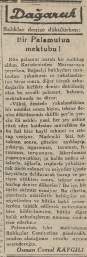 “Vâkıâ, denizde yakalandıktan bir müddet sonra bizim, denize dökülmemiz “küllü şey’in yerciu ilâ aslıhi” yani, her şey aslına rücû eder kaidesine muvafıksa da bu hal bize hayli zahmet ve ıztırap veriyor. Mademki bizi, tuttuktan sonra, güzelce ayıklayıp, yıkayıp, ızgaramızı, tavamızı, fırınımızı, turşumuzu, lâkerdamızı yapmıyacaklar, şu halde neden oltalarla, ağlarla, ırıplarla yakalıyarak türlü zahmet ve eziyetler içinde kayıklara doldurarak harap ve perişan ettikten sonra, tekrar cumburlop denize dökerler? Bu işe, bir türlü aklımız ermiyor. Bu cihetin, gazeteniz marifetile balıkçılar cemiyetinden ve bütün balık sevenlerden tahkik edilerek neticesinin bildirilmesini, bütün diğer baık arkadaşlarım namına sizden rica ederim.”