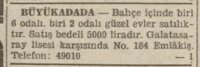 Bahçe içinde biri 6 odalı biri 2 odalı güzel evler satılıktır. Satış bedeli 5000 liradır. Galatasaray lisesi karşısında No. 184 Emlâkiş Telefon:49010