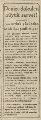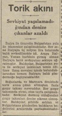 Balıkçılar buz tedarik edemedikleri için evvelki gece balık avına çıkmamışlardı. İtalyan ve Yunan balık alıcılarından sonra Rumenler de balıklarımıza taliptir. Toriğin çiftine vasati olarak avuç dolusu para verdikleri halde balık bulamıyorlar. Balıkçılarımız da kayıkları ve ağlarile adamları hazır olup ve balık da bulunduğu halde bir türlü faaliyete geçilemiyor.