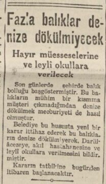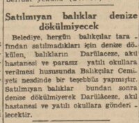 Belediye, hergün balıkçılar tarafından satılmadıkları için denize dökülen balıkların Darülâceze, akıl hastanesi ve parasız yatılı okullara verilmesi hususunda Balıkçılar Cemiyeti nezdinde bir teşebbüs yapmıştır. Satılmıyan balıklar bundan sonra denize dökülmiyerek Darülâceze, akıl hastanesi ve yatılı okullara gönderilecektir.