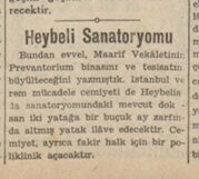 Bundan evvel, Maarif Vekâletinin Preventorium binasını ve tesisatını büyülteceğini yazmıştık. İstanbul verem mücadele cemiyeti de Heybeliada sanatoryomundaki mevcut doksan iki yatağa bir buçuk ay zarfında altmış yatak ilâve edecektir. Cemiyet, ayrıca fakir halk için bir poliklinik açacaktır.
