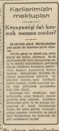 Dördü erkek ve dördü kız, sekiz kişilik bir kafile, ellerlnde 20-25 santimetrelik birer kocayemişi dalı, ve tüfekli muhafızlarla çevrili olarak hükümet konağına getirildiler. Suçları, kocayemişi dalları kesmiş olmalarıdır. Tabiidir ki, orman muhafızlığı müdürü, bu gençleri hemen, aynı dakikada serbes bıraktı, hattâ nezaketi daha ileri götürerek gençlerden özür bile diledi.