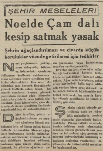 Noel yortusunun yaklaşması dolayısile, bilhassa Adalardaki çamların dallarının kesilerek satılmasına mâni olmak üzere şimdiden tedbirler alınmaktadır. Her sene Adalardan çam keserek Beyoğlunda yüksek fiatlarla satan, fakat, bu suretle çamların kanına girerek çamlıklara suikast eden kimseler hakkında şiddetle ceza tatbik olunacaktır. Bazı kimselerin, çam dalı satmak üzere şimdiden faaliyete hazırlandıkları da anlaşılmaktadır.