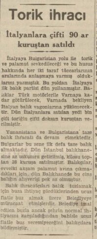 Yunanistandan, Bulgaristandan ve İtalyadan mühim miktarda talepler vuku bulmaktadır. Şehrimizde toriklerin çifti 90 kuruştan satılmaktadır.