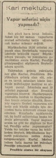 Yalovadan gelmiş yolcularla her gün Kartal, Pendikten Büyükadaya gelmiş olan süt, sebze ve tavuk satıcıları iskele üzerinde mütehayyır kaldılar ve nihayet çareyi İstanbula saat 19 seferini yapacak olan Erenköy vapuruna binerek Haydarpaşaya çıkmakta bulduk ve Haydarpaşadan trenle evimize döndük. Erenköy vapuru Heybeli vapuruna nisbetle çok küçük olduğu için denizden fazla müteessir olması icap ederken Kınalıada açıklarında iki, üç hafif sallantıdan başka bir deniz göremedik. Vapur kaptanı acaba ne gibi bir düşünce ile Kartal, Pendiğe sefer yapmamıştır? Yolda bir tehlike varsa bu tehlikeden Heybeli, Büyükadanın kıymetli yolcularını neden dolayı esirgememiştir. Kartal iskelesi lodosa fazla maruz ise yolcuları Pendiğe çıkarmak kabildi.