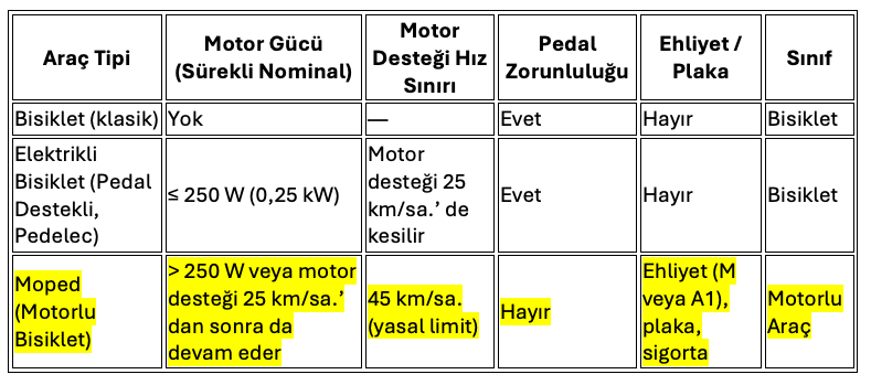Bisiklet: Motoru yoktur veya varsa en fazla 250 watt gücündedir. Pedal desteği olmadan 25 km/s’ i geçmez. Ehliyet, plaka, tescil gerekmez. 250 watt üzerindeki bisikletler yasaktır.