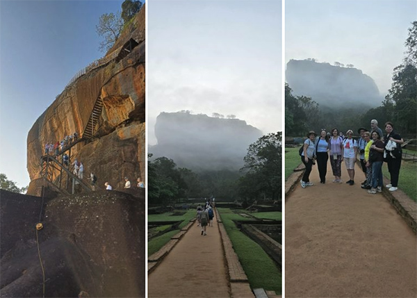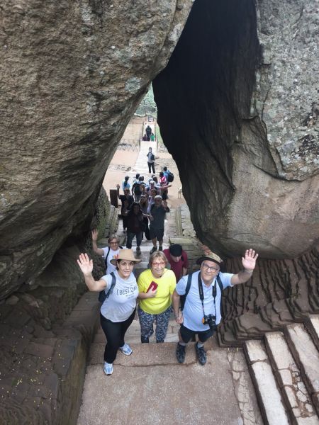 Sıcağa kalıp zorlanmamak için sabah beşte uyanıp kahvaltı yaptıktan sonra dünyaca ünlü kadim kayalık kale Sigiriya’nın keşfine çıkıyoruz. Devasa bir kaya olan Sigiriya Antik Kenti, UNESCO Dünya Kültür Mirası listesinde yer alıyor. Sri Lankalılar, Sigiriya’nın dünyanın sekizinci harikası olduğu söylüyor. Ağaçlar ile kaplı ovanın ortasında beliriveren dev kaya kütlesi gerçekten büyüleyici. Yakınlardaki mağaralarda M.Ö 5500’de yaşayan insanların izleri bulunmuş. Kral Kashyapa I (M.S 477-495) babasını öldürüp başa geçince kardeşinin korkusundan mecburen bu kayanın üzerine, saray ve kale, kayanın bir tarafına da aslan biçiminde bir geçit inşa ettirmiş. Dev aslan ayakları merdivenlerin iki yanında yer alıyor. Buranın ismi de bu yapıdan geliyor: Sīnhāgiri, Aslan Kayası (Singapur’un Sanskritçe adı olan Aslan Şehri Sinhapura’ya benziyor). Kral on sekiz yıl burada korku içinde yaşayıp sonra hayatına son vermiş. Ölümünden sonra başkent terk edilmiş. Kayanın zirvesine su bahçeleri, çeşme sistemleri, kayanın eteklerine hendek ve duvarlar yaptırmış. Saray binası da 13. yüzyıla kadar bir Budist manastır olarak kullanılmış. Sigiriya Kayası yerden iki yüz metre, deniz seviyesinden üç yüz altmış metre yüksekte yer alıyor. Kayalık alana kadar merdivenlerden çıkılıyor, kayalık alandan demir merdivenler ile tırmanılıyor. Toplamda bin iki yüz basamak, kayalık kısımdaki basamakların kenarında tutunma yeri var. Toplam iniş-çıkış süresi hızlı tırmananlar için iki saat sürüyor. 5. yüzyılda inşa edilen “Gökyüzündeki Şato”nun konumlandığı bu kaya parçası Sri Lanka adasındaki en ilgi çekici yerlerden. Şatoya çıkan merdivenlerde tarih öncesinden kalma çizimlerden günümüze ulaşan kadın figürlerini görmek mümkün. Grubumuz kademe kademe sekiz yüz basamağı tırmanıyor. Arada taraçalar ve bahçeler, hendekler ve havuzlar var. Bazı merdivenler çok dik nefes kesiyor. Sekiz yüzde durup aslan ayaklarının arasında grup resmi çektiriyoruz. Son dört yüz basamak oldukça dik; zirvede insan yapımı granit havuzlar bulunuyor ve en tepeden aşağıya bakmak daha güzel diye anlatıyor çıkanlar.