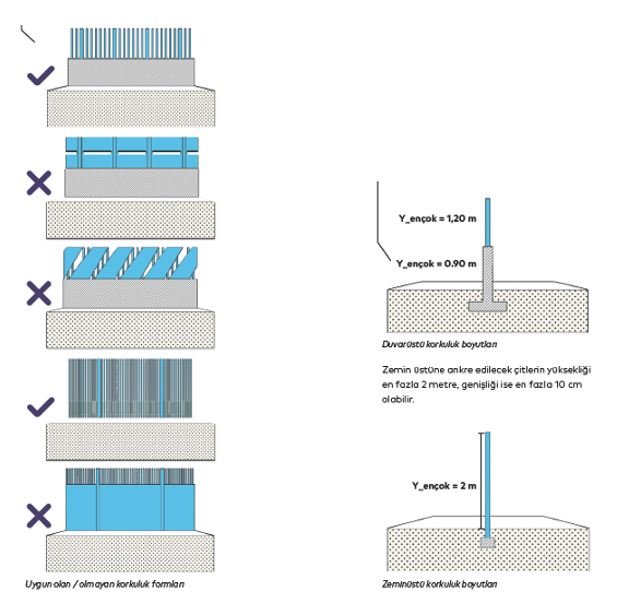 Zemin üstüne ankre edilecek çitlerin yüksekliği en fazla 2 metre, genişliği ise en fazla 10 cm olabilir.