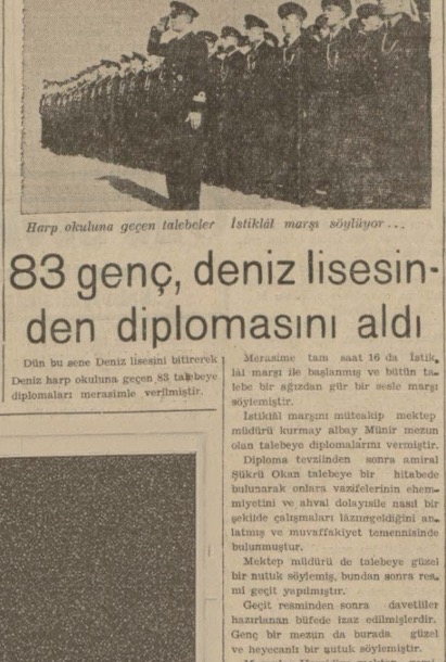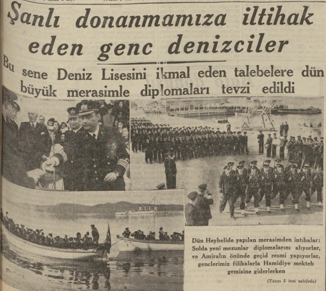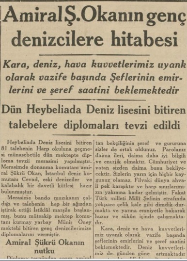 Bu sene Heybeli Deniz lisesini bitirerek donanmamıza iltihak eden gençlere, dün okul bahçesinde diplomaları tevzi edilmiştir. Amiral Şükrü Okanla emekli Amiral Vasıf ve bir çok deniz erkânımızın teşrif ettiği merasime, Deniz Harb okulu mızıkasının çaldığı İstiklâl marile başlanmıştır. Müteakıben okul kumandanı yarbay Münir Öney tarafından okulu bitiren gençlere diplomaları tevzi edilmiştir.