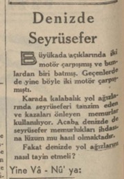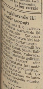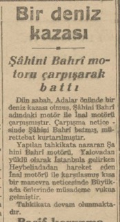 Dün sabah, Adalar önünde bir deniz kazası olmuş, Şahini Bahri adındaki motör ile İnal motörü çarpışmıştır. Çarpışma neticesinde Şahini Bahri batmış, mürettebat kurtarılmıştır.