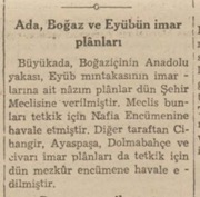 Büyükada, Boğaziçinin Anadolu yakası Eyüb mıntakasının imarlarına ait nâzım plânlar dün Şehir Meclisine verilmiştir. Meclis bunları tetkik için Nafia Encümenine havale etmiştir. Diğer taraftan Cihangir, Ayaspaşa, Dolmabahçe ve civarı imar plânları da tetkik için dün mezkûr encümene havale edilmiştir.