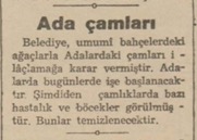 Belediye, umumi bahçelerdeki ağaçlarla Adalardaki çamları ilaçlamağa karar vermiştir. Adalarda bugünlerde işe başlanacaktır. Şimdiden çamlıklarda bazı hastalık ve böcekler görülmüştür. Bunlar temizlenecektir.