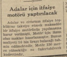 Adalar ve civarının itfaiye teşkilâtını takviye etmek maksadile bir itfaiye motörünün yapılmasına karar verilmişti. Motör için lâzım olan makine hazırlanmıştır. Bunun maliyeti 10 bin lirayı bulacağı tahmin edilmektedir. Motör 150 metre yüksekliğe su fışkırtabilecek kudrettedir.