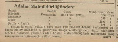 Yukarıda evsafı yazılı 4 adet balık voli mahalli 4/5/941 tarihinden itibaren bir ay müddetle ve pazarlıkla kiraya verileceğinden talip olanların 5/5/941 pazartesi gününe kadar Adalar malmüdürlüğünde müteşekkil satış komisyonuna müracaatları ilan olunur. (2847)