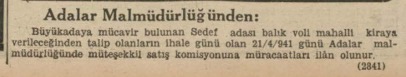 Büyükadaya mücavir bulunan Sedef adası balık voli mahalli kiraya verileceğinden talip olanların ihale günü olan 21/4/941 günü Adalar malmüdürlüğünde müteşekkil satış komisyonuna müracaatları ilân olunur. (2841)