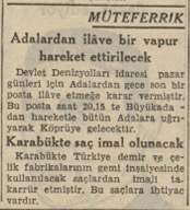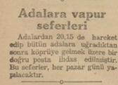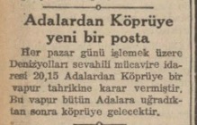 Her pazar günü işlemek üzere Denizyolları sevahili mücavire idaresi 20,15 Adalardan Köprüye bir vapur tahrikine karar vermiştir. Bu vapur bütün Adalara uğradıktan sonra köprüye gelecektir.
