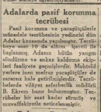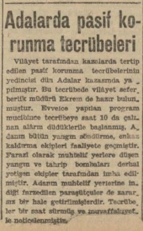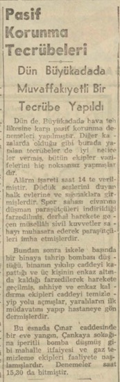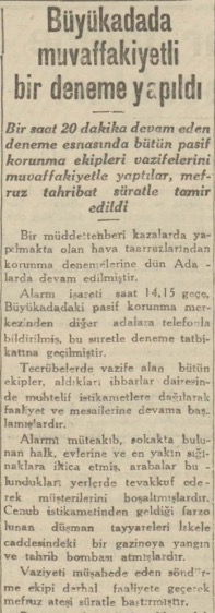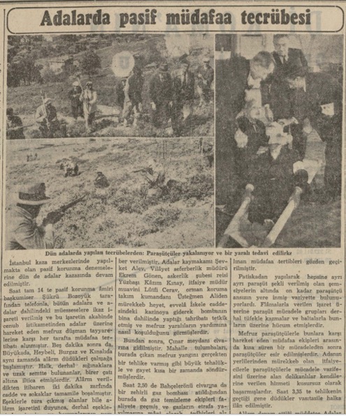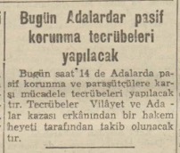 Pasif korunma ve paraşütçülerle mücadele tecrübesinin yedincisi dün Adalar kazasında yapılmıştır. Tecrübeye saat 10 da alarm işareti ile başlanmış, Adanın bütün yangın söndürme ve enkaz kaldırma ekipleri faaliyete geçmişlerdir. Muhtelif yerlere inen mefruz paraşütçüler de zararsız hale getirilmişlerdir. Tecrübelerde vilâyet seferberlik müdürü B. Ekrem hazır bulunmuştur. Tecrübeler bir saat kadar sürmüş ve muvaffakiyetle neticelenmiştir.