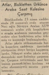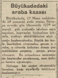 Büyükadada, 23 Nisan caddesinde 28 numaralı evde oturan Süreyya evvelki gün idaresinde 3279 numaralı yük arabasile iskeleye eşya taşırken, hayvanlar birdenbire ürkmüş, arabayı alabildiklerine sürümeğe başlamışlardır. Büyük bir hızla Saatkulesi civarından geçen araba, o civarda bulunan demir parmaklıklara çarpmış, parça, parça olmuştur. Bu müsademe neticesinde hayvanlar yaralanmış, saat kulesi hasara uğramıştır.