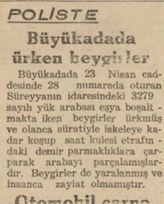 Büyükadada 23 Nisan caddesinde 28 numarada oturan Süreyyanın idaresindeki 3279 sayılı yük arabası eşya boşaltmakta iken beygirler ürkmüş ve olanca süratiyle iskeleye kadar koşup saat kulesi etrafındaki demir parmaklıklara çarparak arabayı parçalamışlardır. Beygirler de yaralanmış ve insanca zayiat olmamıştır.