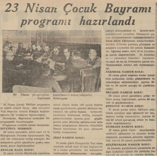 23 Nisan günü cumhuriyet meydanında yapılacak törenden sonra, ilk okulda, bir talebe müsameresi tertip olunacak ve çocuklar arabalarla gezdirilecektir.