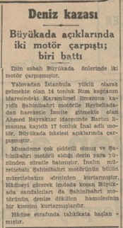 Yalovadan İstanbula yüklü olarak gelmekte olan 14 tonluk Rıza kaptanın idaresindeki Karamürsel limanına kayıtlı Şahinibahri motörile Heybeliadadan hareketle İzmite gitmekte olan Ahmed Bayraktar idaresinde Bartın limanına kayıdlı 17 tonluk İnal adlı motör, Büyükada iskelesi açıklarında çarpışmıştır.
