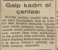 30/3/941 tarihine tesadüf eden pazar günü Kınalıadada 19 40 da hareket eden Erenköy ismindeki vapurda siyah renkte çantanın içinde Havva isminde tatbik mühürile nüfus cüzdanımı veraset ilâmı vergi makbuzları ve tek pırlanta küpe mevcuttu. Bulan kimse Beşiktaş Bostancıbaşı sokak No. 2 de Havva Gülesin’e getirdiği takdirde memnun edilecektir.