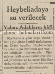 Büyükadada şehir suyu aboneleri 1 yıl içinde 1 misli fazlalaşmıştır. Diğer taraftan Heybeliadaya da şehir suyu verilmesi için yapılan tetkikler ilerlemiştir. Eğer miktarı kâfi abone bulunursa tesisat yapılacak ve bu sular Büyükadada olduğu gibi liman idaresinin römorkörleri ile naklonulacaktır.