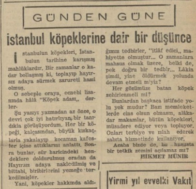 Şu yazıyı yazmadan az önce, o devri çok iyi hatırlıyan bir tanıdıkla görüşüyordum. Her bir köpeği, kalçasından, büyük kıskaçlarla yakalayıp kocaman kafesler içine attıklarını anlattı. Sonra bunlar, sûr haricindeki hendeklere doldurulmuş oradan da Hayırsız adaya nakledilmiş ve bittabi, biribirlerini yemeğe terkedilmişler.