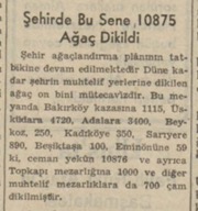 Şehir ağaçlandırma plânının tatbikine devam edilmektedir. Düne kadar şehrin muhtelit yerlerine dikilen ağaç on bini mütecavizdir. Bu meyanda Bakırköy kazasına 1115, Üsküdara 4720, Adalara 3400, Bey koz 250, Kadıköye 350, Sarıyere 890, Beşiktaşa 100, Eminönüne 59 ki, ceman yekûn 10876 ve ayrıca Topkapı mezarlığına 1000 ve diğer muhtelif mezarlıklara da 700 çam dikilmiştir.