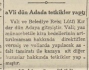 Vali ve Belediye Reisi Lütfi Kırdar dün Adaya gitmiştir. Vali; yaz münasebetile kira bedellerinin arttırılmaması hakkında direktifler vermiş ve yollarda yapılacak asfalt tamiratı ile kazaya ait diğer hususlar hakkında tetkikler yapmıştır.