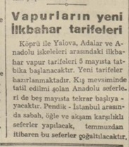 Köprü ile Yalova, Adalar ve Anadolu iskeleleri arasındaki ilkbahar vapur tarifeleri 5 mayısta tatbika başlanacaktır. Yeni tarifeler hazırlanmaktadır. Kış mevsiminde tatil edilmiş olan Anadolu seferleri de beş mayısta tekrar başlıyacaktır. Pendik – İstanbul arasında sabah, öğle ve akşam karşılıklı seferler yapılacak, temmuzdan itibaren bu seferler çoğaltılacaktır.
