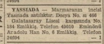 Galatasaray Lisesi karşısında No. 184 Emlâkiş. Telefon 49010 Eminönü Anadolu Han No. 6 Emlâkiş Telefon 24694