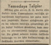 Birkaç gün evvel S. G. Savcı “On Satır”ında Yassıadanın satılığa çıkarılması keyfiyetini bir şaka mevzuu yapmıştı. Haber aldığımıza göre bu adanın satılığa çıkarıldığı şüyu bulur bulmaz şimdiden bazı zengin ve ehemmiyetli talipler çıkmıştır. Bu güzel adanın kimin üstünde kalacağı ve ne işte kullanılacağı da dedikodu mevzuu olmaktadır.
