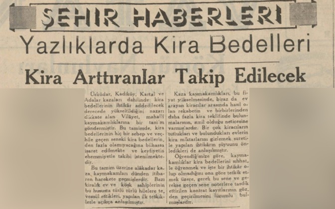 Üsküdar, Kadıköy, Kartal ve Adalar kazaları dahilinde kira bedellerinin ihtikâr addedilecek derecede yükseltildiğini nazarı dikkate alan Vilâyet, mahalli kaymakamlıklarına bir tamim göndermiştir. Bu tamimde, kira bedellerinin hiçbir sebep ve veçhile geçen seneki kira bedellerinden fazla olamıyacağına bilhassa işaret edilmekte ve keyfiyetim ehemmiyetle takibi istenmektedir.