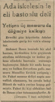Mehmet İhsan isminde bir akıl hastası, birdenbire kriz geçirerek etrafına saldırmağa ve önüne gelene elindeki bastonla vurmağa başlamıştır. İskele bir anda karışmış ve halkın feryadına polis memuru Muzaffer Ertürk yetişmiştir. Fakat memur deliyi zapta muvaffak olamamış, bu sırada bekçi Hüsnü de vak’a yerine koşup gelmiştir. Fakat iki kişi oldukları halde İhsanı yine tutamamışlardır. Akıl hastası elindeki bastonla ve yumruklarile ikisini de döğmüş ve muhtelif yerlerinden yaralamıştır. Bunlara yardıma gelen komiser muavini Cemalin de yakasına sarılarak ötesini, berisini yırtan akıl hastası güçlükle yakalanarak Adliyeye gönderilmiştir.