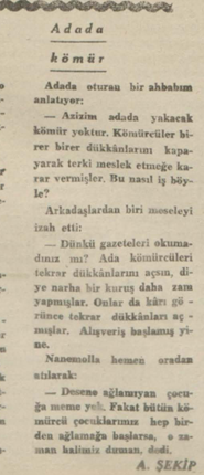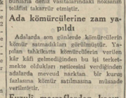 Adalarda son günlerde kömürcülerin kömür satmadıkları görülmüştür. Yapılan tahkikatta kömürcülerin verilen kâr kâfi gelmediğinden bu işi terketmekte oldukları neticesini verdiğinden adalarda mevcud narktan bir kuruş fazlasına kömür satılmasına müsaade verilmiştir.