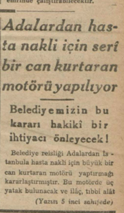 Belediye reisliği Adalardan İstanbula hasta nakli için büyük bir can kurtaran motörü yaptırmağı kararlaştırmıştır. Bu motörde üç yatak bulunacak ve ilaç, tıbbi alât edevatı da ihtiva edecektir.