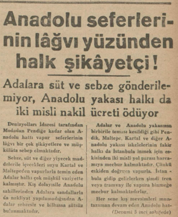 Her sene kış mevsimleri muntazaman devam eden Anadolu hattı seferlerinin bu sene iskelelerin tamir edilmesi için kaldırıldığı söylenmişti. Fakat aradan iki ay geçtiği halde seferlere tekrar başlanılması için Denizyolları İdaresinin hiç bir harekette bulunmadığı hayretle görülmektedir.