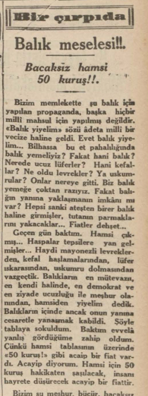 Bizim memlekette şu balık için yapılan propaganda, başka hiçbir milli mahsul için yapılmış değildir. “Balık yiyelim” sözü adeta milli bir vecize haline geldi. Evet balık yiyelim… Bilhassa bu et pahalılığında balık yemeliyiz? Fakat hani balık? Nerede ucuz lüferler? Hani kefallar? Ne oldu levrekler? Ya uskumru? Onlar nereye gitti. Biz balık yemeğe çoktan razıyız. Fakat balığın yanına yaklaşmanın imkânı mı var? Hepsi sanki ateşten birer balık haline girmişler, tutanın parmaklarını yakacaklar. Fiatler dehşet…