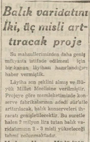 Layiha son şeklini almış ve Büyük Millet Meclisine verilmiştir. Projeye göre memleketimizde konserve fabrikalarının adedi sür’atle arttırılacak, balık konserveleri ihracatı genişletilecektir. Bu suretle halen 2 milyon lira tutan balık varidatımızın 2 -3 misli yükseleceği tahmin olunmaktadır.