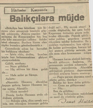 Bu ayların değişmez haberlerinin başında da gene balık konusu geliyor. Bir yandan balık bolluğunu konu alan haberler, diğer yandan balık fiyatlarının yüksekliğinden şikâyet eden yazılar gazetelerin vaz geçilmezleri arasında yer alıyor.