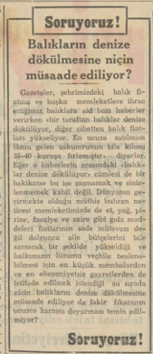 Gazeteler, şehrimizdeki balık fiatına ve başka memleketlere ihrac ettiğimiz balıklara aid bazı haberler verirken bir taraftan balıklar denize dökülüyor, diğer cihetten balık fiatları yükseliyor. En ucuza satılması lâzım gelen uskumrunun bile kilosu 35-40 kuruşa fırlamıştır, diyorlar. Eğer o haberlerin arasındaki “balıklar denize dökülüyor” cümlesi de bir hakikatse bu işe şaşmamak ve sinirlenmemek kabil değil. Dünyanın geçirmekte olduğu müthiş buhran neticesi memleketimizde de et, yağ, pirine, fasulye ve saire gibi gıda maddeleri fiatlarının sade mütevazı değil dolgunca aile bütçelerini bile sarsacak bir şekilde yükseldiği ve halkımızın lüzumu veçhile beslenebilmesi için en küçük membalardan ve en ehemmiyetsiz gayretlerden de istifade edilmek istendiği şu sırada niçin balıkların denize dökülmesine müsaade ediliyor da fakir fıkaranın ucuzca karnını doyurması temin edilmiyor?