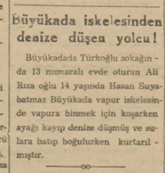 Büyükadada Türkoğlu sokağında 13 numaralı evde oturan Ali Rıza oğlu 14 yaşında Hasan Suyabatmaz Büyükada vapur iskelesinde vapura binmek için koşarken ayağı kayıp denize düşmüş ve sulara batıp boğulurken kurtarılmıştır.