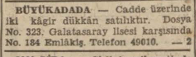 Cadde üzerinde iki kâgir dükkân satılıktır. Dosya No. 323. Galatasaray Lisesi karşısında No. 184 Emlâkiş. Telefon 49010.