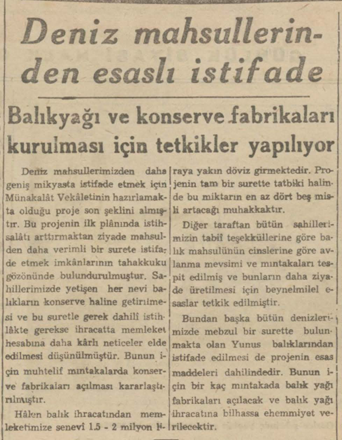 Deniz mahsullerimizden daha geniş mikyasta istifade etmek için Münakalât Vekâletinin hazırlamakta olduğu proje son şeklini almıştır. Bu projenin ilk plânında istihsalâtı arttırmaktan ziyade mahsulden daha verimli bir surete istifade etmek imkânlarının tahakkuku gözönünde bulundurulmuştur. Sahillerimizde yetişen her nevi balıkların konserve haline getirilmesi ve bu suretle gerek dahili istihlâkte gerekse ihracatta memleket hesabına daha kârlı neticeler elde edilmesi düşünülmüştür. Bunun için muhtelif mıntakalarda konserve fabrikaları açılması kararlaştırılmıştır.